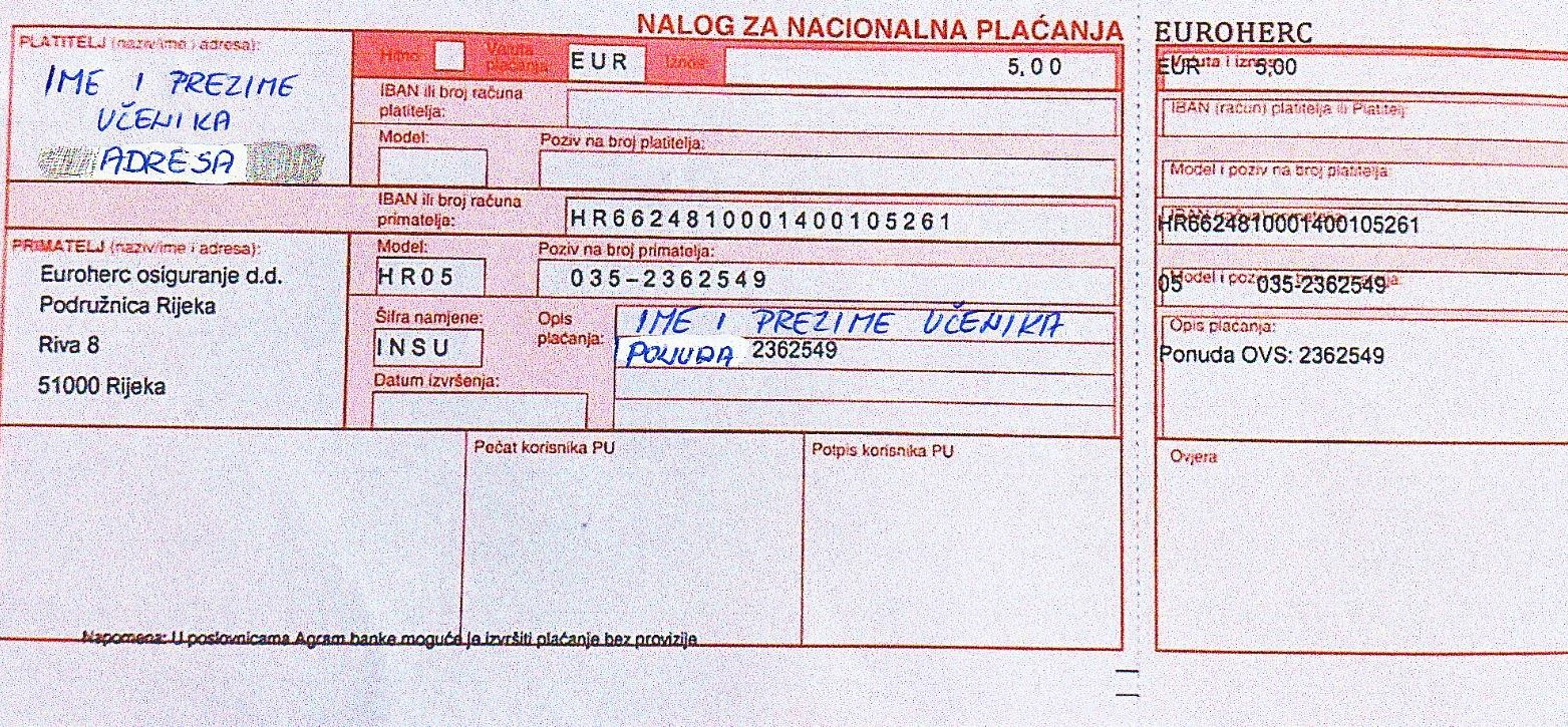 – u opisu plaćanja potrebno je navesti Ime i prezime učenika, Ponuda 2362549 za koga se plaća premija